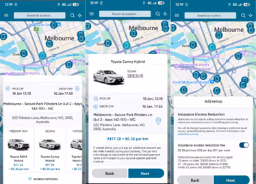 Miranda considers those near her city apartment and lands on the Toyota Camry, which will suit her hire needs. She is quoted $17.28 + $0.36 per km for the hire. Once she is happy with this, she selects Next.