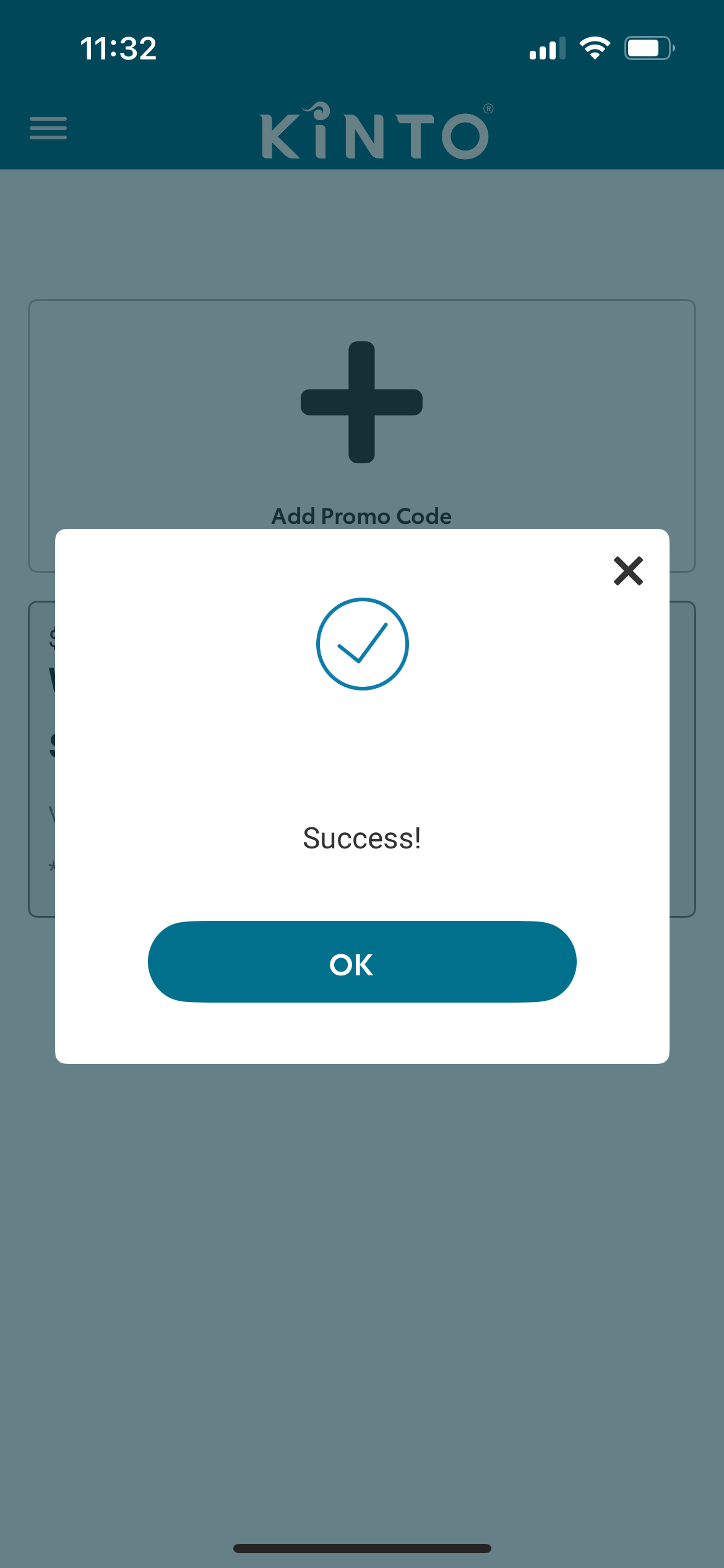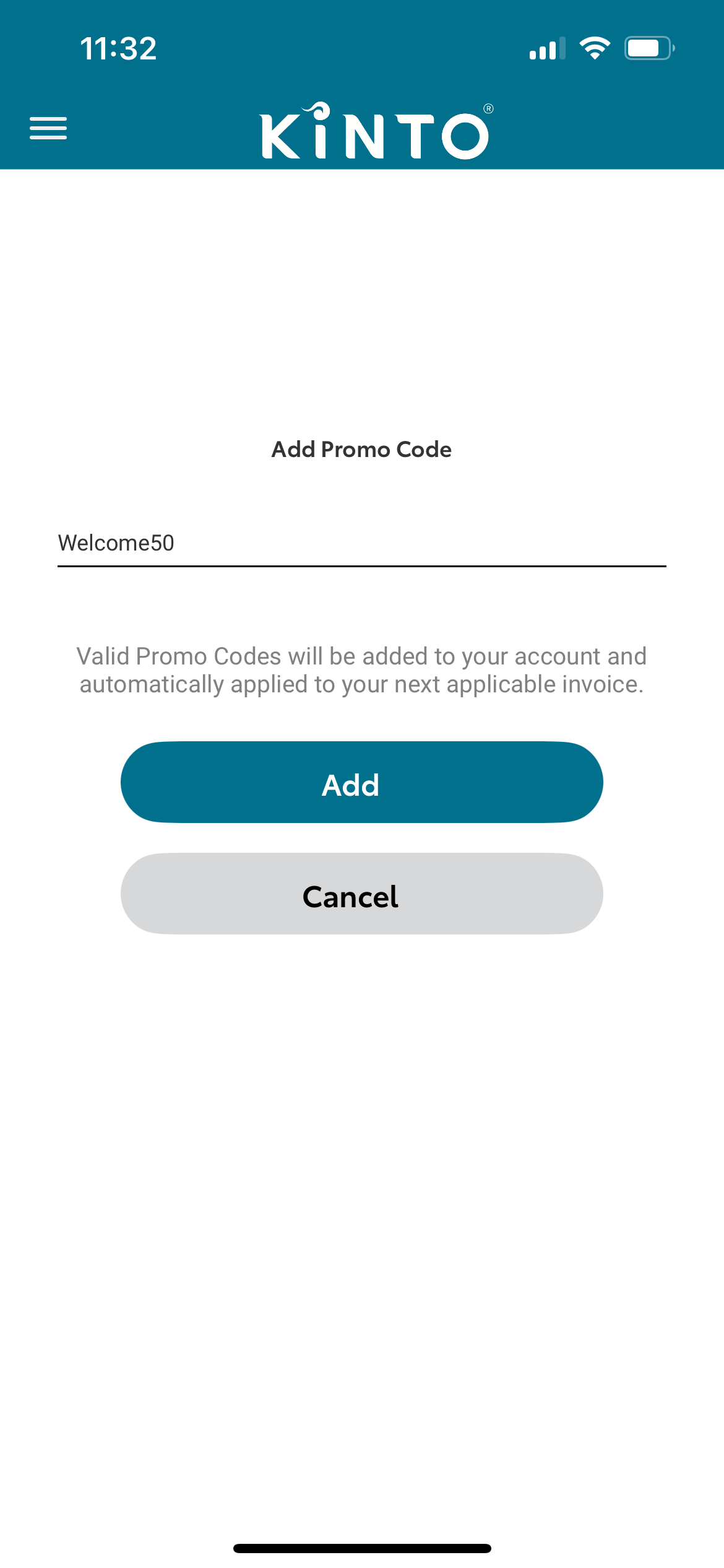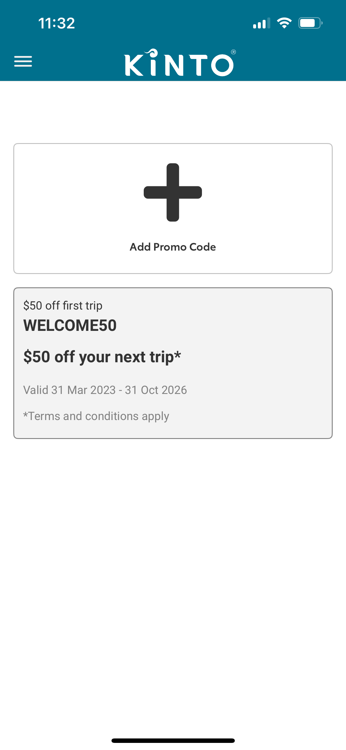 For example, open Promo codes, select the + symbol to add the promo code, enter the promo code, we have used the code WELCOME50, which is valid for use on your first KINTO car hire booking for $50 off. Select add, and you’re all set!