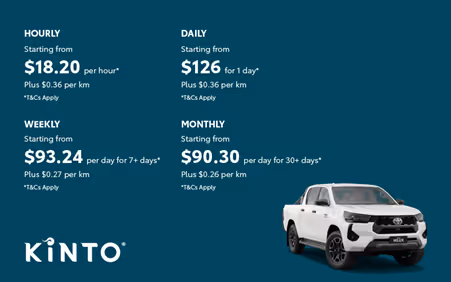 KINTO offers the Toyota HiLux Double Cab 4×4 from $18.20 per hour or $126 for 1 day, plus a per-kilometre rate that drops the longer you hire. KINTO does not change prices based on weekends or rush hours. ( Please note, these rates are accurate as of November 2025, at the time of writing this guide .)